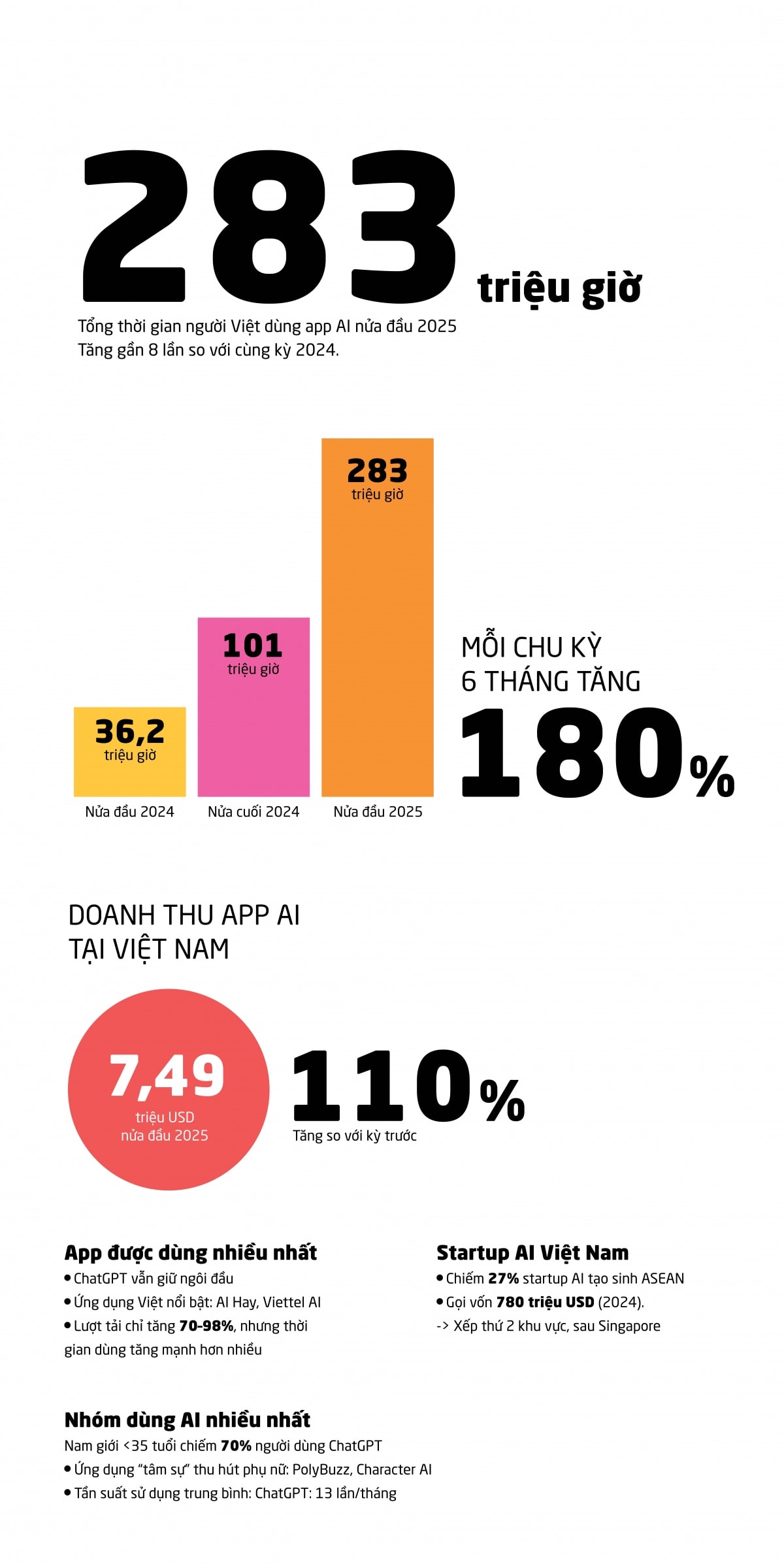 Trong nửa đầu năm 2025, tổng thời gian người Việt sử dụng các ứng dụng AI đạt 283 triệu giờ, tăng gần 8 lần so với cùng kỳ 2024. Cùng với đó, doanh thu từ các app AI tại Việt Nam cũng tăng hơn 110%, phản ánh tốc độ bùng nổ của công nghệ trí tuệ nhân tạo trong đời sống hàng ngày.